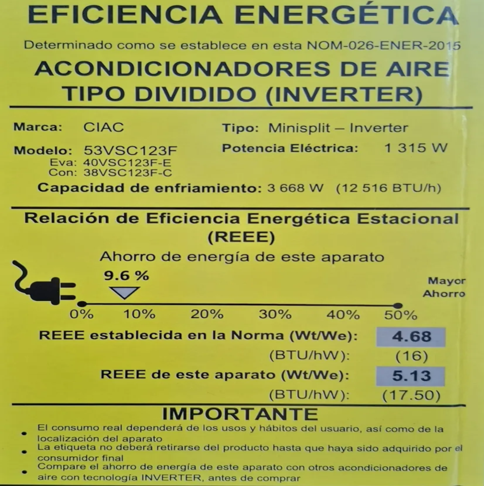 El Mini Split Ciac by Carrier Inverter 53VSC123 es la solución ideal para quienes buscan un ambiente fresco y confortable en sus espacios. Con su tecnología inverter, este aire acondicionado ofrece un rendimiento eficiente, adaptándose a las necesidades de climatización de su hogar u oficina. Hasta 18+ SEER de eficiencia que aseguran el mayor confort al usuario consumiendo la menor cantidad de energía por la operación y funciones que entrega. Eficiencia certificada por laboratorios y autoridades mexicanas. El nuevo sistema VS R32, ofrece una amplia variedad de funciones que se adaptan a las diferentes necesidades y situaciones del usuario, entre ellas la función “FOLLOW ME” que permite ajustar la temperatura en base al sensor que integra el control remoto y así lograr la temperatura deseada en una zona específica del lugar, el modo “TURBO” que nos permite alcanzar la temperatura deseada en el menor tiempo posible, o el modo DRY que disminuye efectivamente la sensación de humedad en el espacio acondicionado y otras funciones más. El sistema incluye un módulo Wi-Fi, lo que permite controlarlo desde la app en cualquier ubicación que se encuentre y asimismo acceder a todas las configuraciones que esta ofrece. Además, la aplicación es compatible con Alexa y Google Home; el panel integra un display que despliega detalles de operación o diagnóstico de posibles errores de la unidad, brindando claridad y seguridad al usuario. El nuevo sistema VS R32 destaca por todas las innovaciones que incorpora, como drenaje de doble vía que facilita la instalación del equipo. La unidad interior cuenta con un botón manual ON/OFF para encender y apagar la unidad, así como otras funciones especiales que protegen al usuario y al equipo. Garantía de fábrica: 1 años